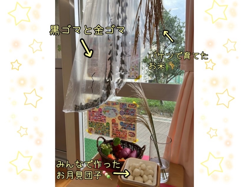 収穫への感謝の意味合いもある十五夜のお供え。手作り団子はもちろん、クラスみんなで育てた『お米』や『ゴマ』も一緒にお供えしました。