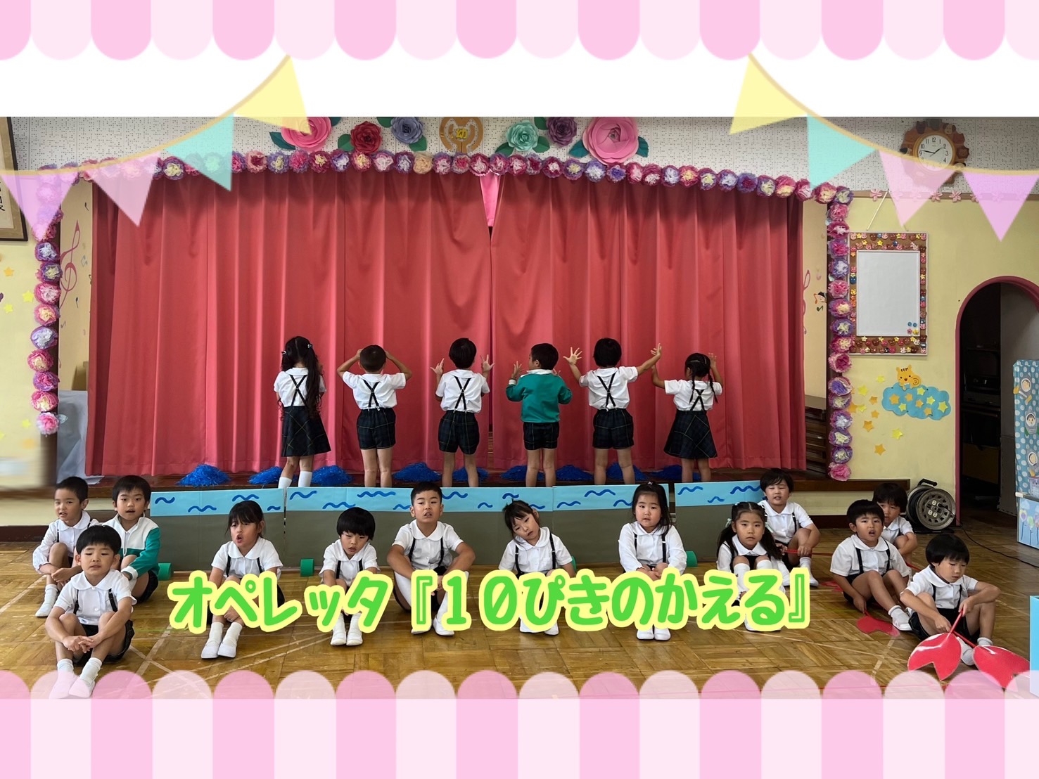 子どもたちが大好きな絵本のひとつである、『10ぴきのかえる』の物語を、すみれ組バージョンで演じます🌈